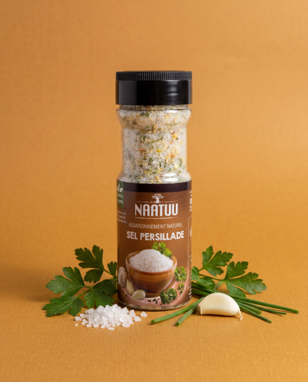 Le Sel Persillade NAATUU associe le persil séché, l’ail et un sel finement dosé en un assaisonnement naturel et sain. Sans MSG ajouté, sans colorants ni arômes artificiels. Il relève vos plats simplement, avec moins de sel et plus de saveur.
